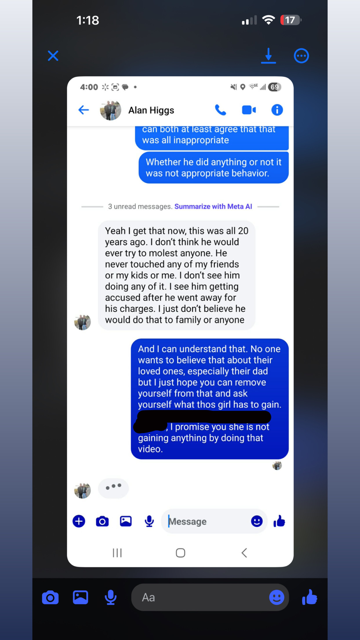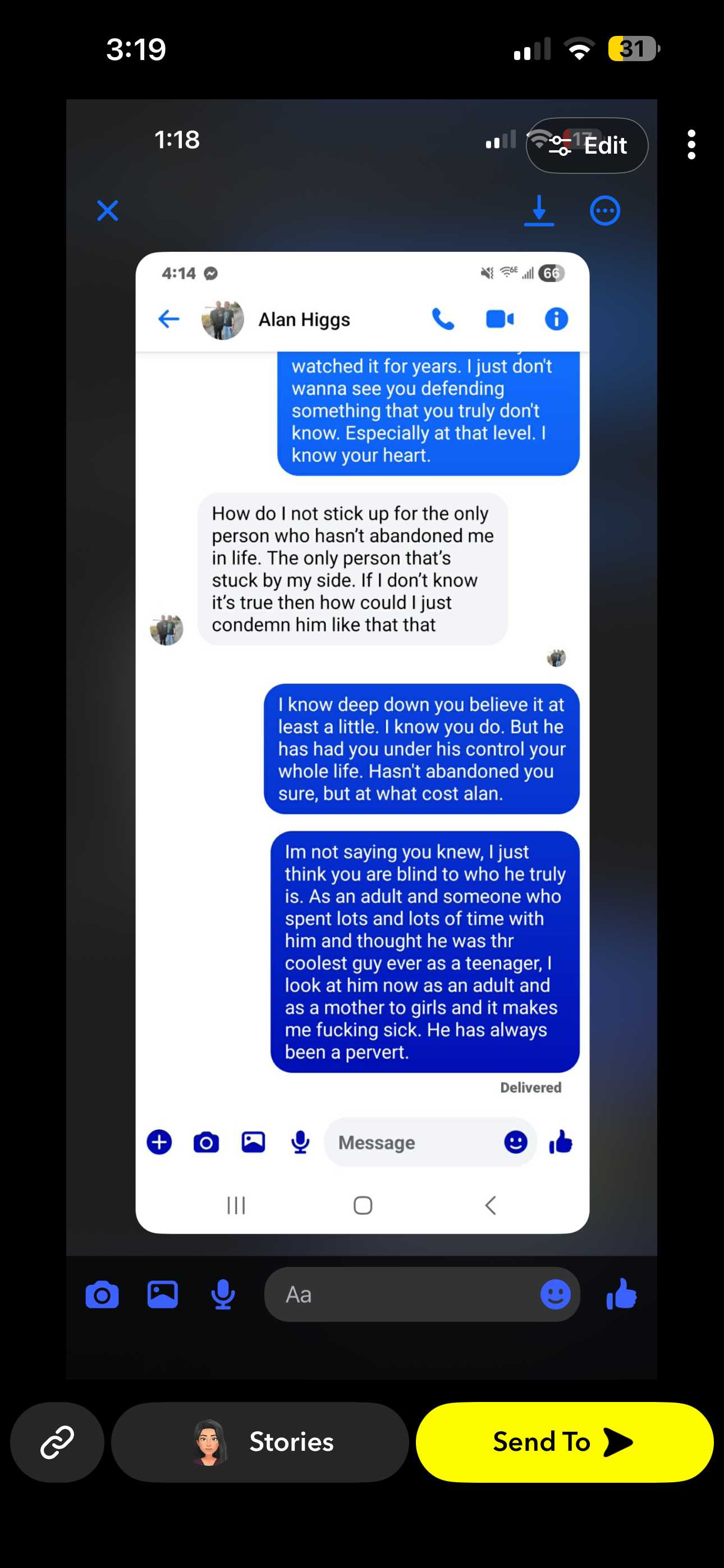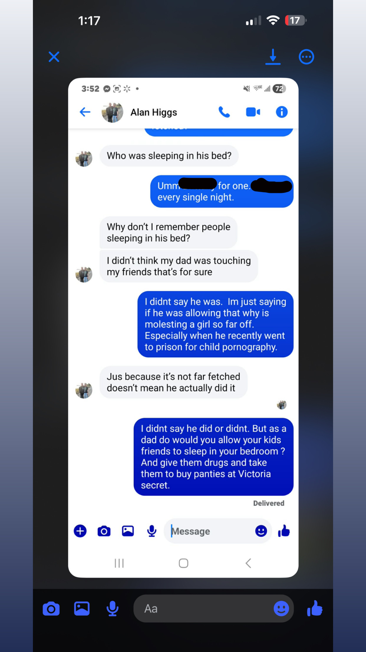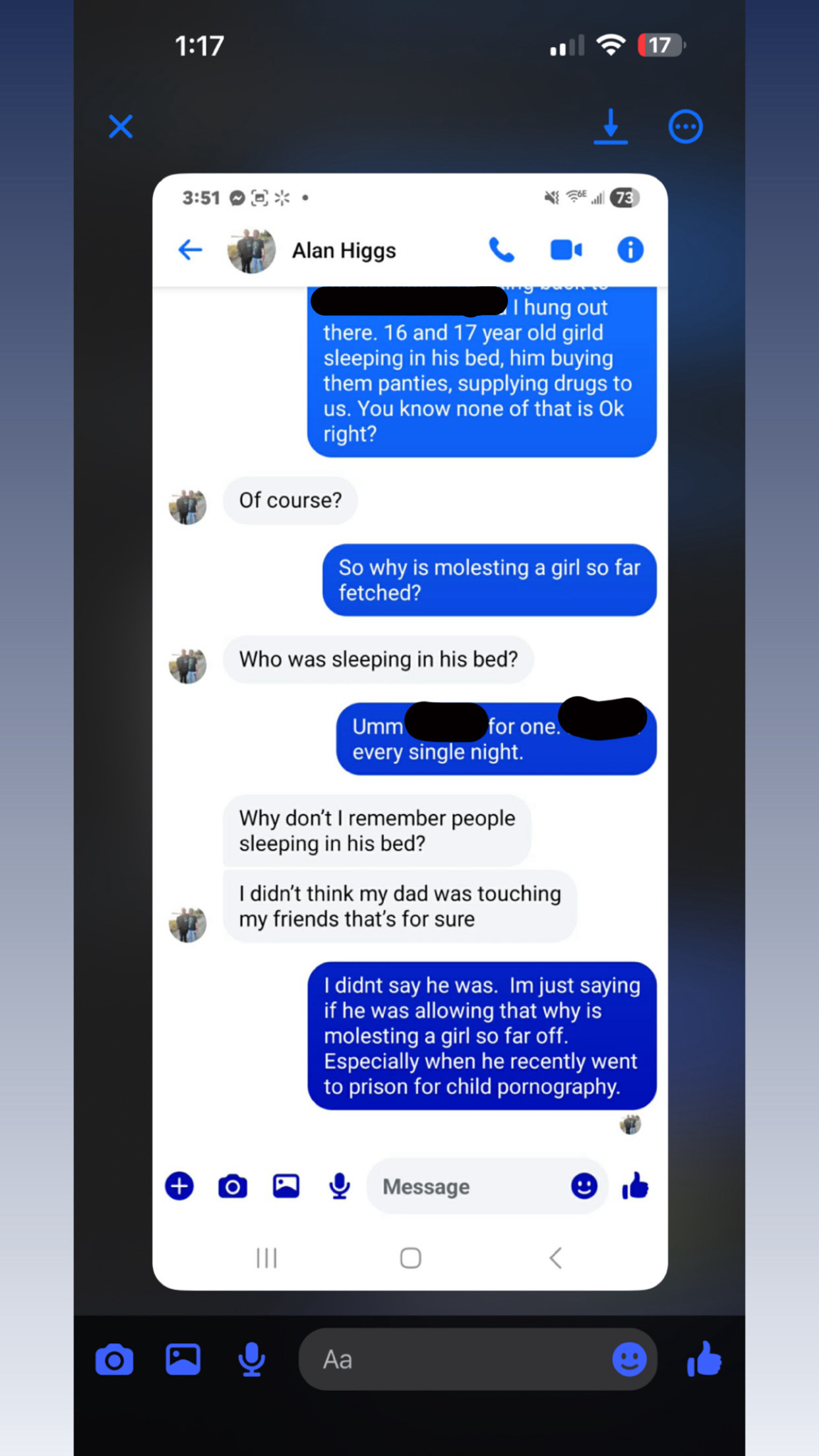 This is Arianna the survivor that confronted their abuser alan Higgs a few days ago. Someone reached out to me privately that is very credible, they shared me this conversation they had with Alan jr before he deleted his Facebook.