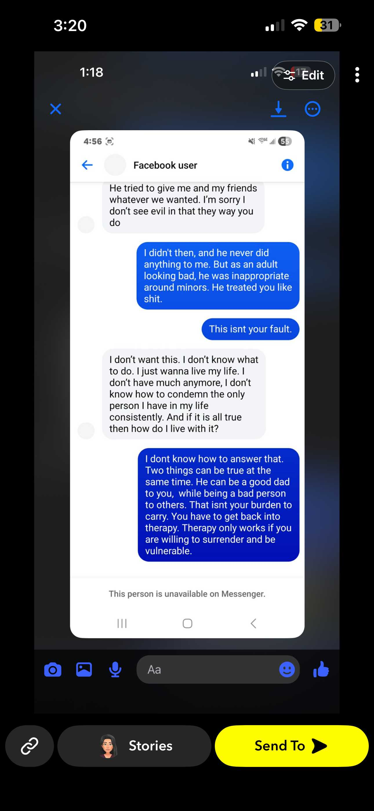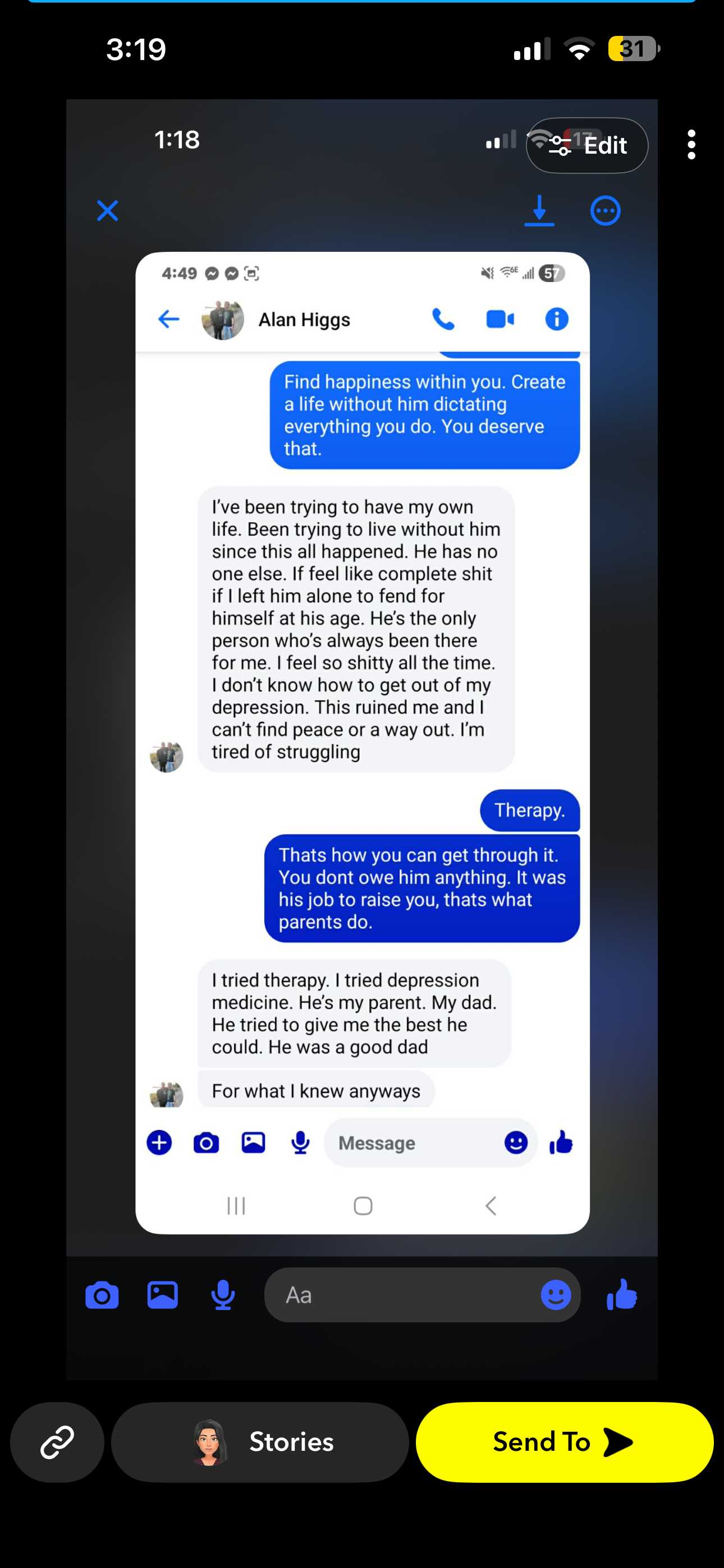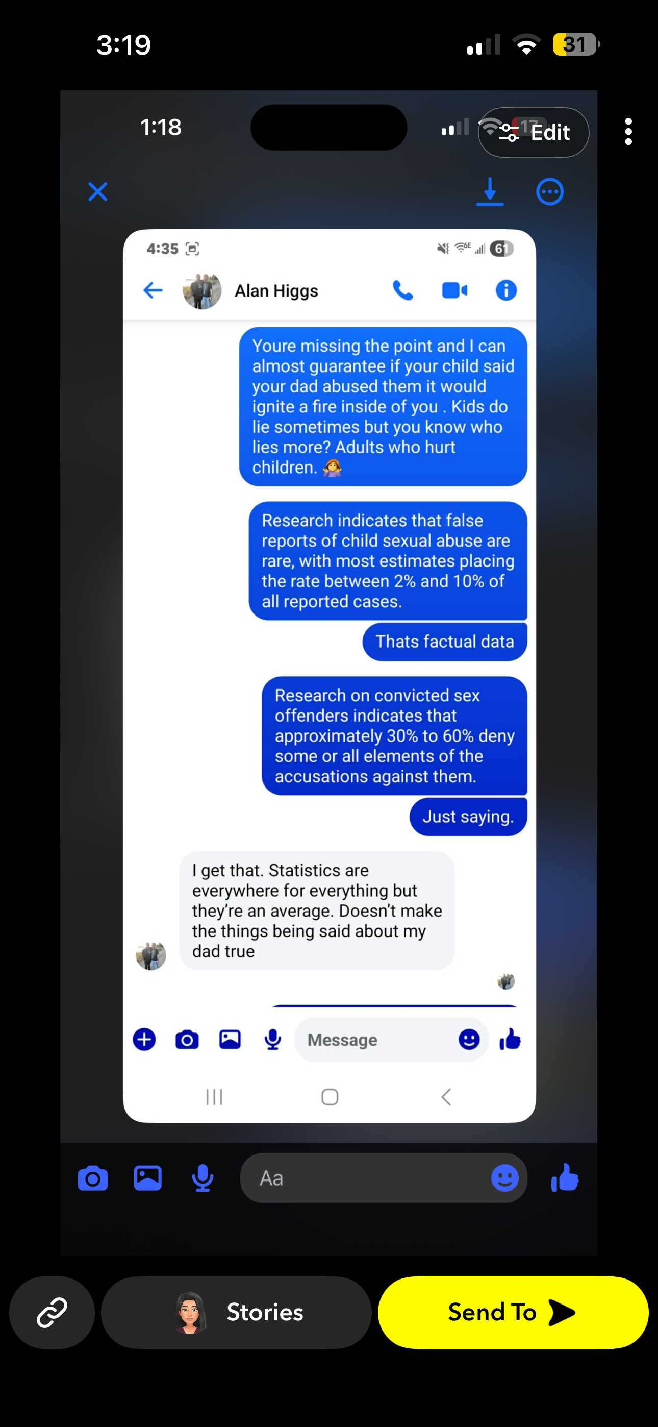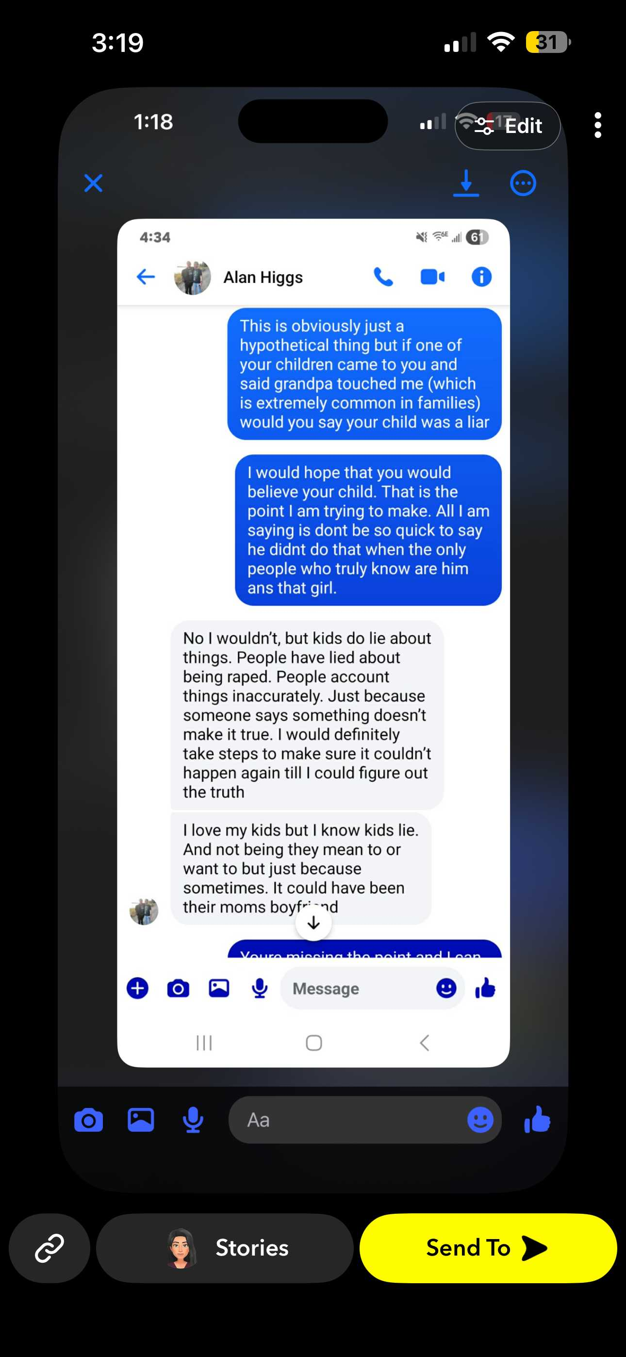 This is Arianna the survivor that confronted their abuser alan Higgs a few days ago. Someone reached out to me privately that is very credible, they shared me this conversation they had with Alan jr before he deleted his Facebook.
